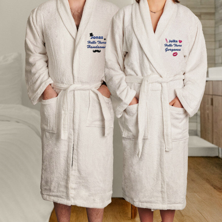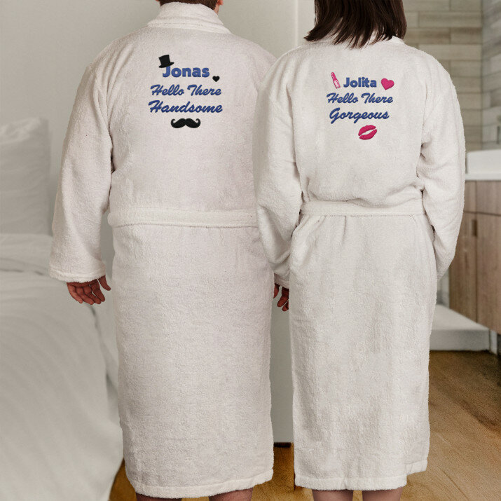 Du universalūs balti chalatai, pagaminti iš 100 % frotte medvilnės. Patogūs, gražūs, minkštutėliai chalatai suteiks puikų komforto jausmą, kai baigsis visi dienos rūpesčiai ir ateis laikas atsipalaiduoti. Jie taip pat sušildys mieguistą kūną, kai tik pabusite. Chalatai puošiami individualizuotais siuvinėjimais, kurie labai gražiai atrodo ir pagerina savijautą, o gaminį paverčia ypatinga dovana!