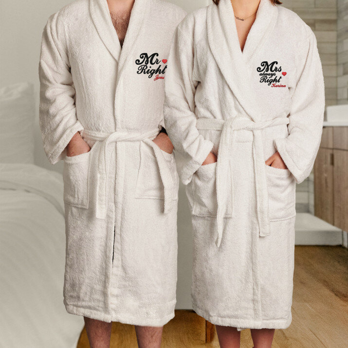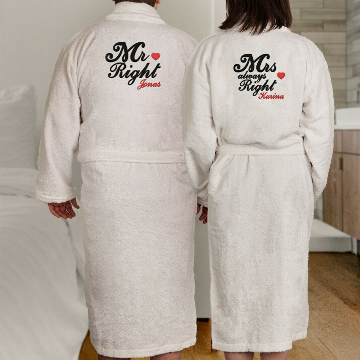 Du universalūs balti chalatai, pagaminti iš 100 % frotte medvilnės. Patogūs, gražūs, minkštutėliai chalatai suteiks puikų komforto jausmą, kai baigsis visi dienos rūpesčiai ir ateis laikas atsipalaiduoti. Jie taip pat sušildys mieguistą kūną, kai tik pabusite. Chalatai puošiami individualizuotais siuvinėjimais, kurie labai gražiai atrodo ir pagerina savijautą, o gaminį paverčia ypatinga dovana!