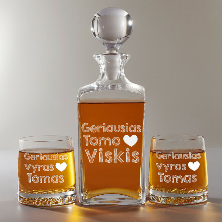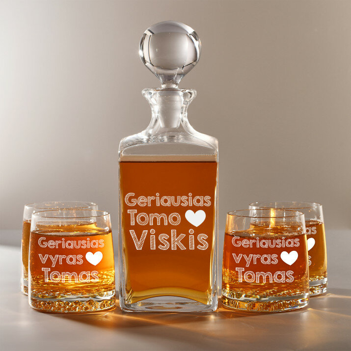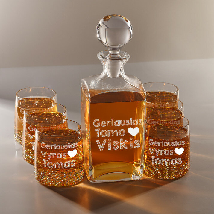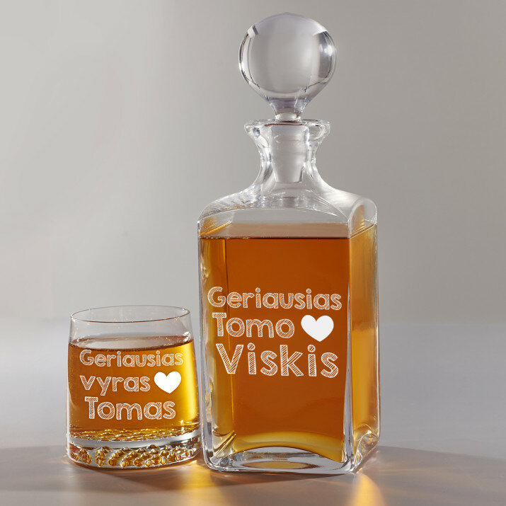 Rinkinys su graviruotu grafinu ir stiklinėmis, galima rinktis iš 4 variantų:Grafinas + 1 stiklinė