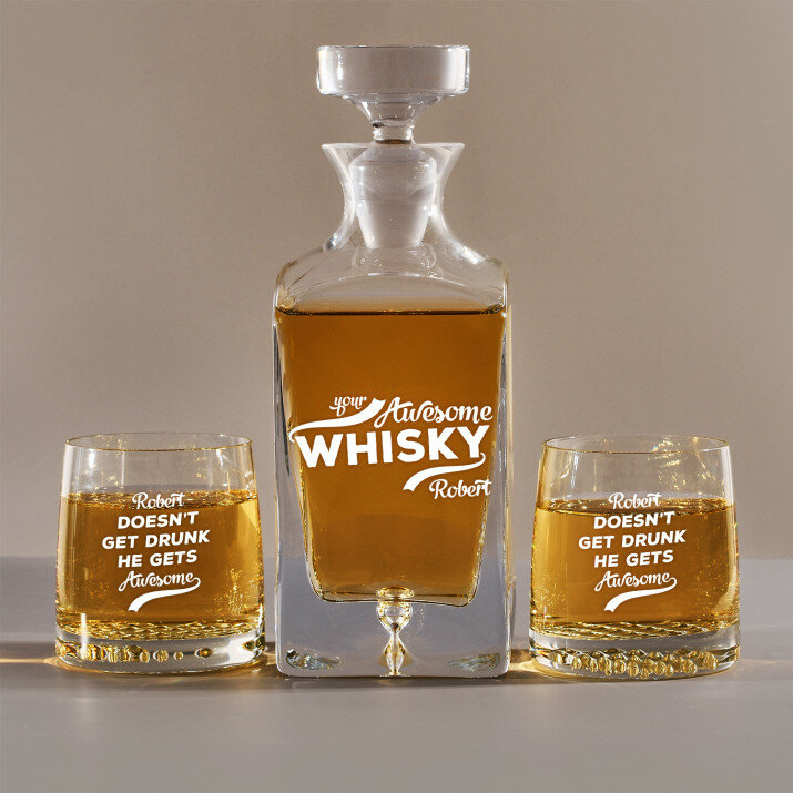 Rinkinys su graviruotu grafinu ir stiklinėmis, galima rinktis iš 4 variantų:Grafinas + 1 stiklinė