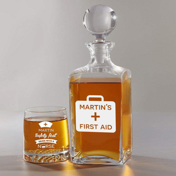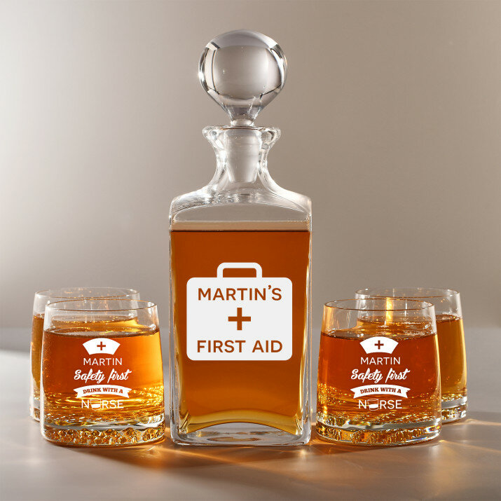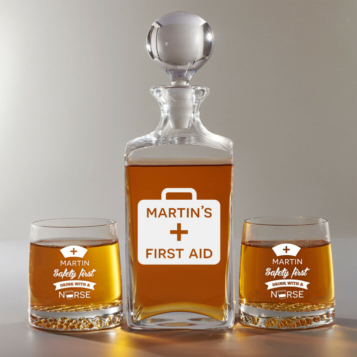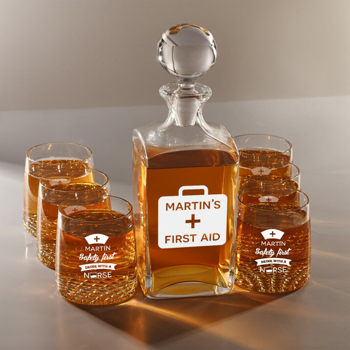 Rinkinys su graviruotu grafinu ir stiklinėmis, galima rinktis iš 4 variantų:Grafinas + 1 stiklinė