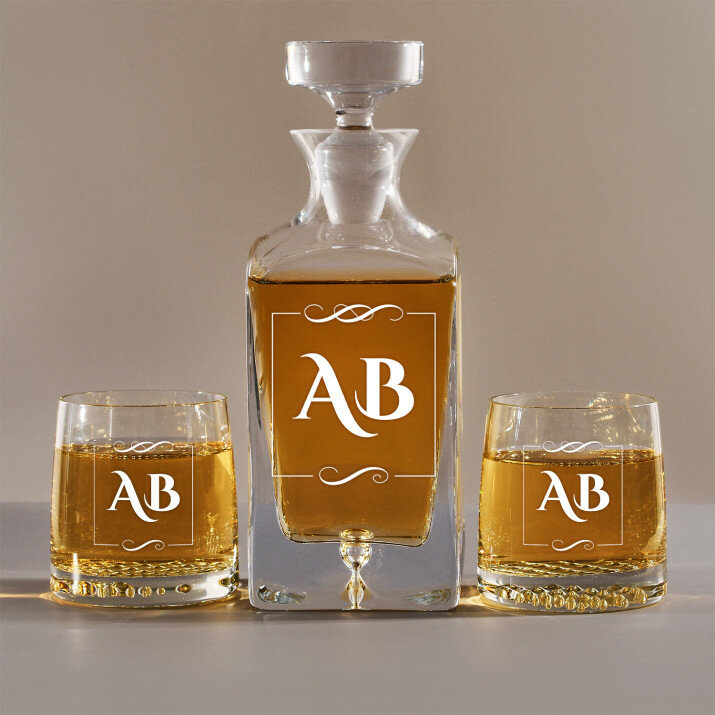 Rinkinys su graviruotu grafinu ir stiklinėmis, galima rinktis iš 4 variantų:Grafinas + 1 stiklinė