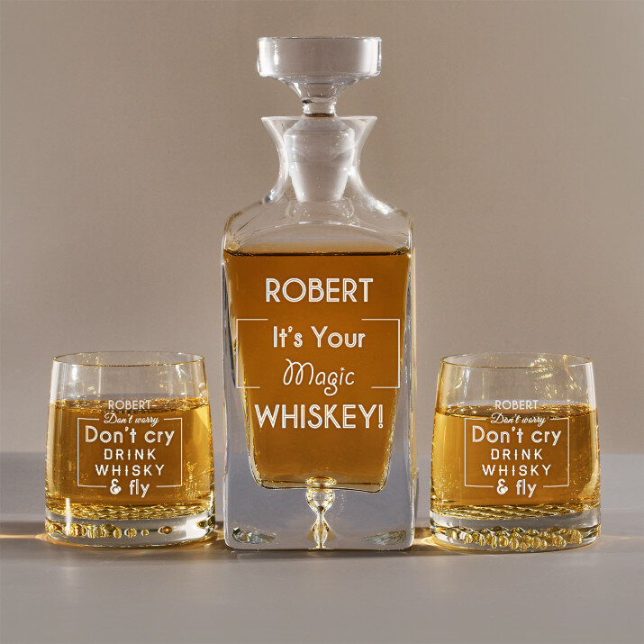 Rinkinys su graviruotu grafinu ir stiklinėmis, galima rinktis iš 4 variantų:Grafinas + 1 stiklinė