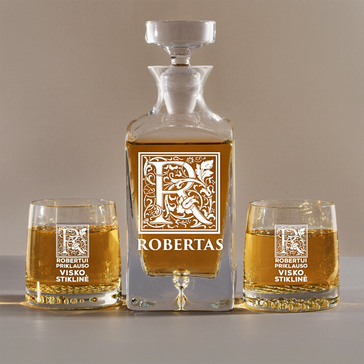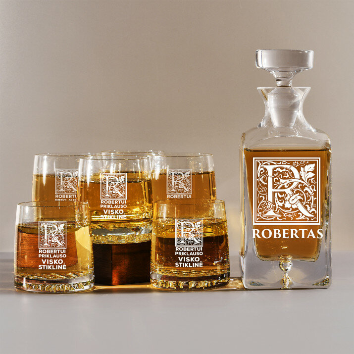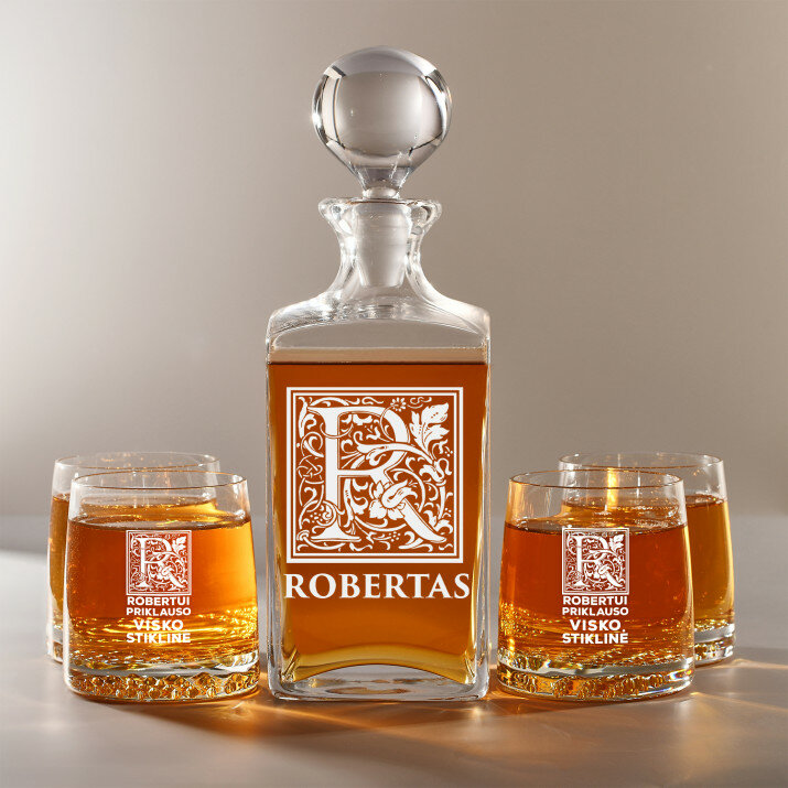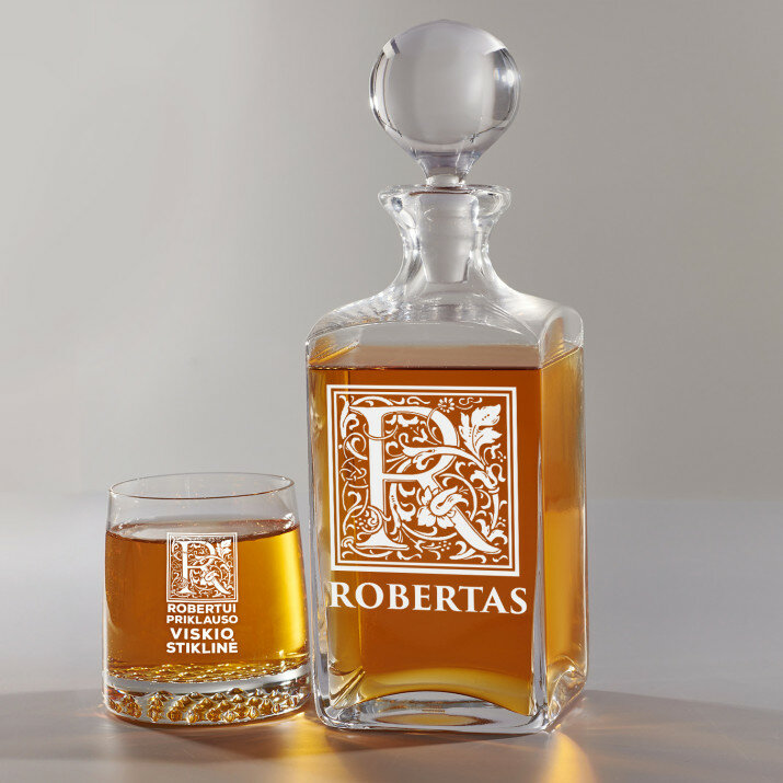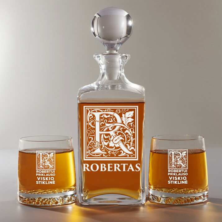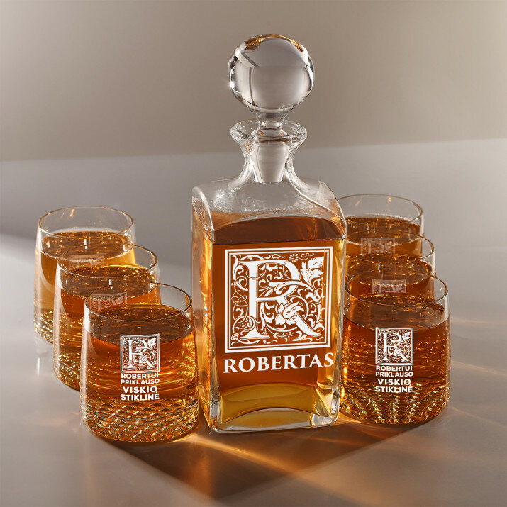 Rinkinys su graviruotu grafinu ir stiklinėmis, galima rinktis iš 4 variantų:Grafinas + 1 stiklinė