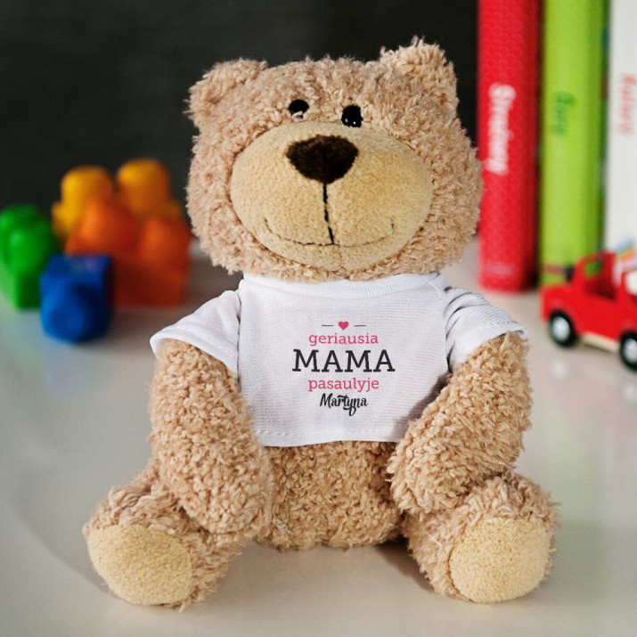 Spauda yra ant pliušinio žaisliuko marškinėlių priekio.