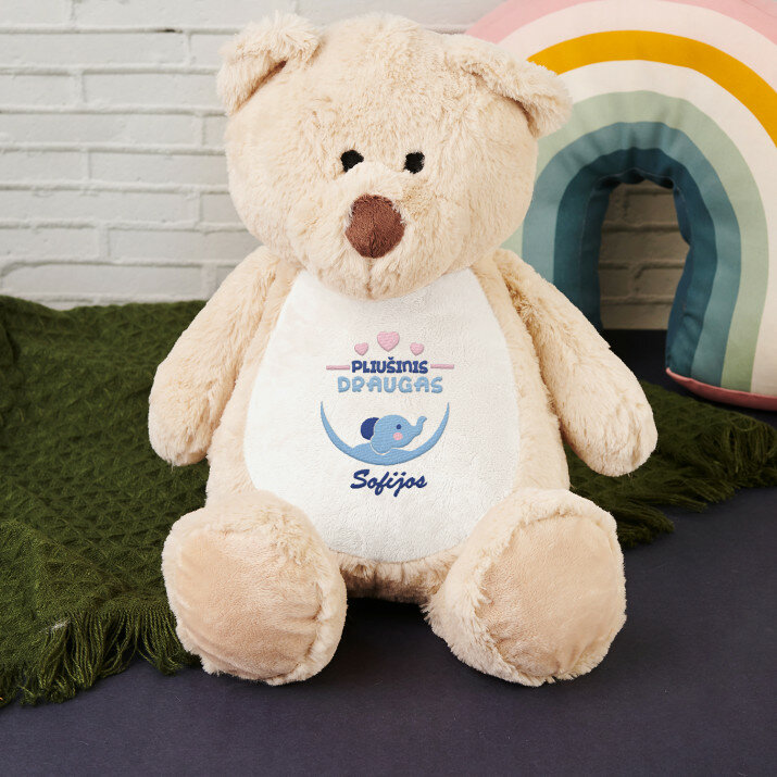 Didelis ir ypač minkštas meškiukas arba triušis, papuoštas vienu iš mūsų individualizuotų siuvinėtų raštų. Pliušinis žaislas, sudėtis: 100% poliesteris. Žaislas turi unikalų užtrauktuką, kuris leidžia išimti jo vidų ir lengvai jį išvalyti. Meškiukas saugus bet kokio amžiaus vaikams. Skalbti tik rankomis. Pliušinio žaislo aukštis: 45 cm.