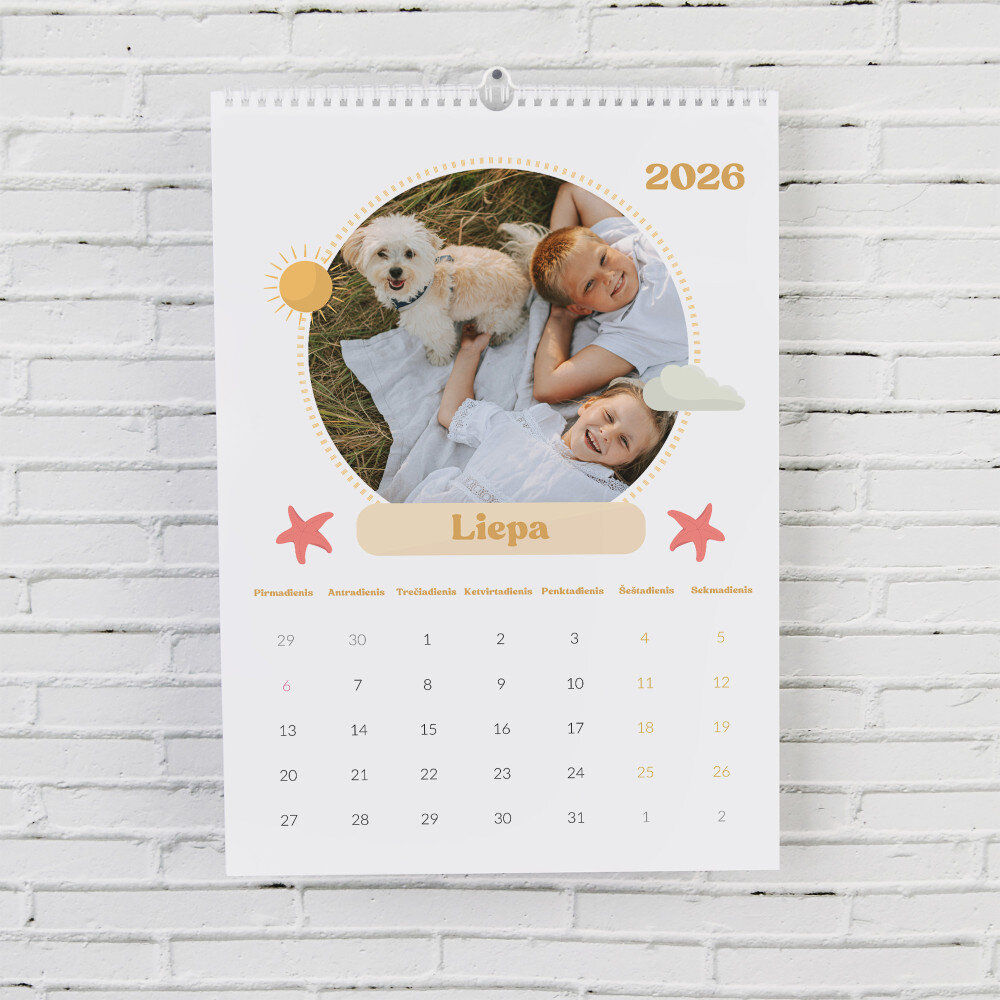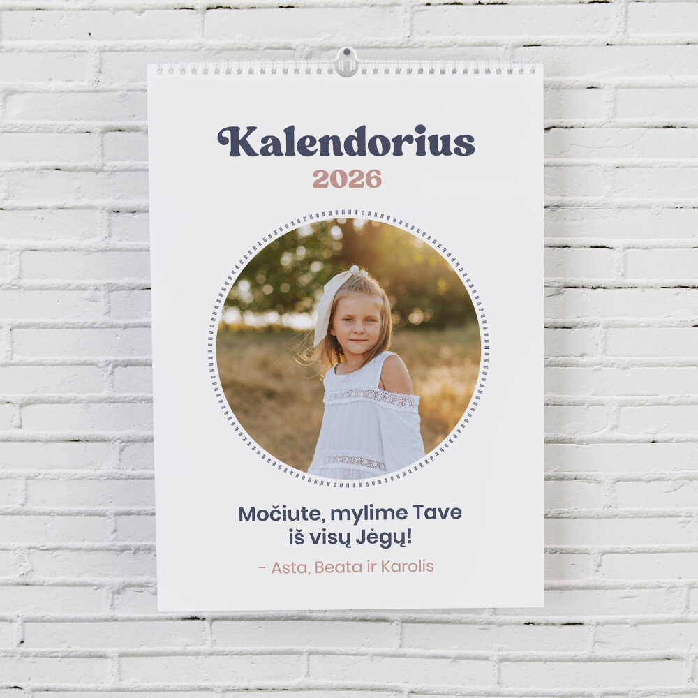 Sieninis kalendorius su Jūsų nuotraukomis yra puiki dovana kaip gražiausių akimirkų atminimas, kurios Jūsų namiškiams suteiks daug šypsenų. Į atrinktomis nuotraukomis papuoštus mėnesius bus malonu žiūrėti! Tai unikali namų puošmena, kurią galite padovanoti, pavyzdžiui, tėvams ar draugams. Kalendorius bus graži dovana arba kaip kūrybingas priedas prie kitos dovanos. Tinka bet kokiai progai!