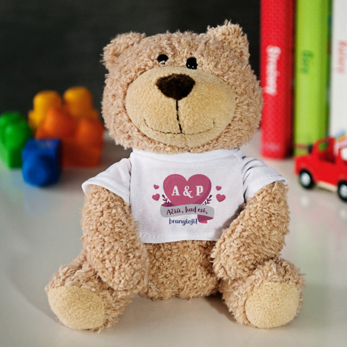 Spauda yra ant pliušinio žaisliuko marškinėlių priekio.