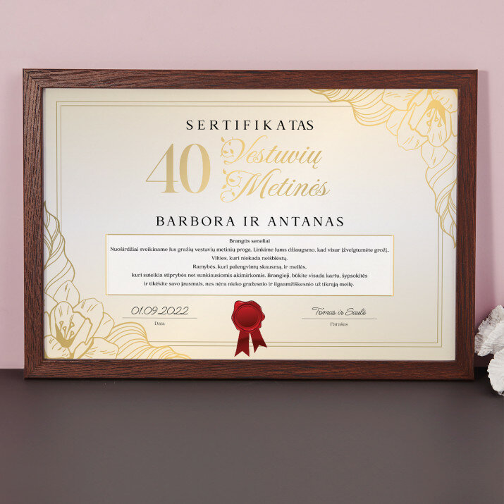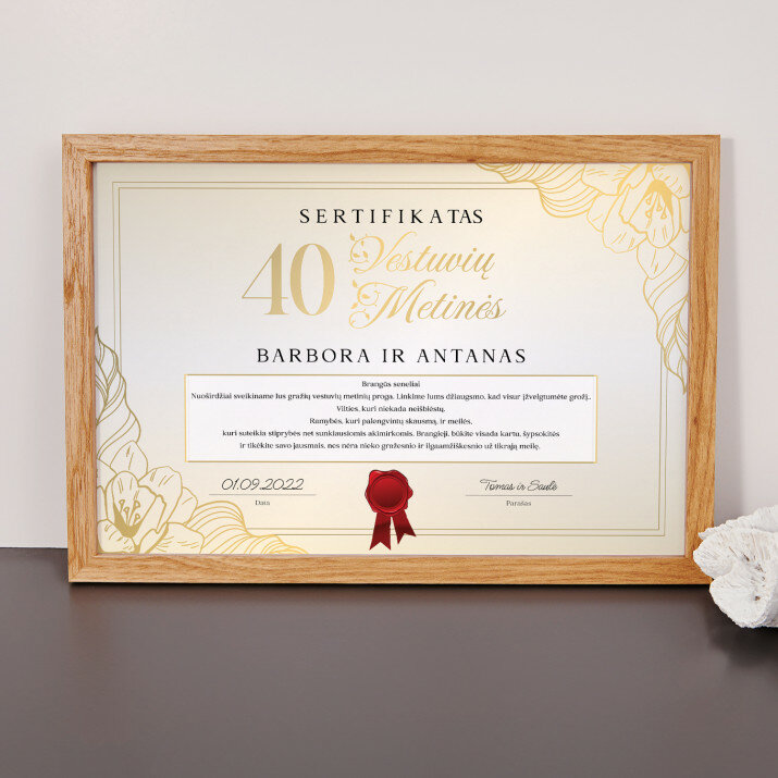 Užsakiau sertifikatą tėvų 40 metų jubiliejui paskutinei minutei. Nevėriau, kad jis spės pasiekti laiku. Ir čia didelis staigmena. Projektas buvo parengtas greitai, jį patvirtinau, o tada gavau žinią, kad kurjeris jau keliauja. Tai atėjo penktadienį 12:00 ir atrodė dar geriau nei nuotraukoje. Toks profesionalizmas ir greitas vykdymas man dar nesutikęs. Manau, kad tai nebus mano vienintelės pirkinių pas jūsų. Linkiu sėkmės! :-)