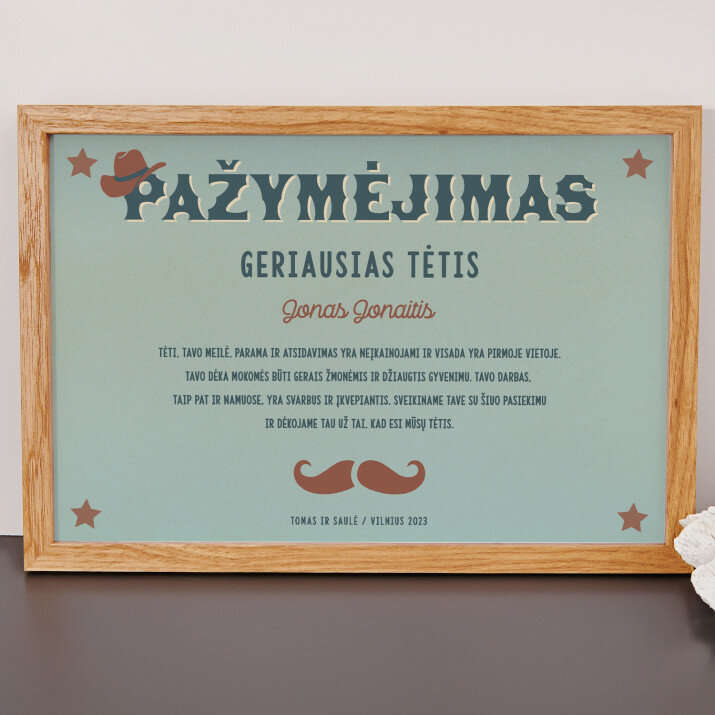 Sertifikatas atspausdintas ant 20x30cm fotopopieriaus ir įrėmintas elegantiškame 20x30cm rėmelyje.