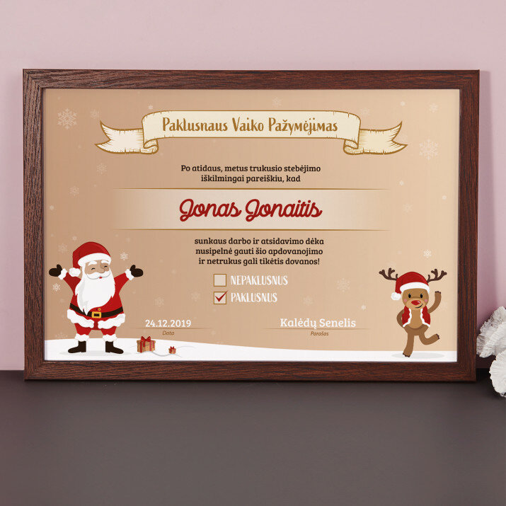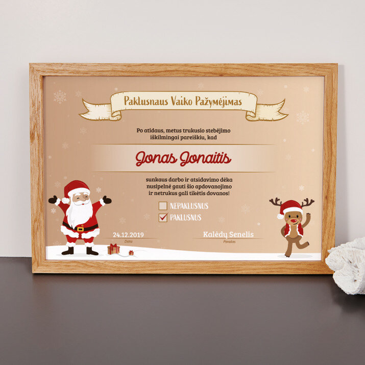 Sertifikatas atspausdintas ant 20x30cm fotopopieriaus ir įrėmintas elegantiškame 20x30cm rėmelyje.