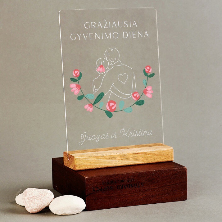 Unikalus suvenyras, kuris pradžiugins apdovanotąjį! Spauda ant 2 mm storio skaidraus akrilinio stiklo (pleksiglas) - tai dovana, kuri tarnaus ilgus metus. Ši medžiaga pasižymi aukšta paviršiaus kokybe ir patvarumu, yra atspari pažeidimams ir išorinėms oro sąlygoms. Elegantiško medinio stovo dėka, spaudinį galima iš karto padėti ant lentynos. Garantuojame, kad tai bus puiki staigmena Jūsų artimiesiems!Stiklo matmenys: 21 x 14,5 cm
