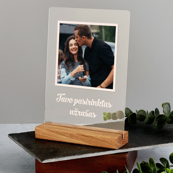 Unikalus suvenyras, kuris pradžiugins apdovanotąjį! Spauda ant 2 mm storio skaidraus akrilinio stiklo (pleksiglas) - tai dovana, kuri tarnaus ilgus metus. Ši medžiaga pasižymi aukšta paviršiaus kokybe ir patvarumu, yra atspari pažeidimams ir išorinėms oro sąlygoms. Elegantiško medinio stovo dėka, spaudinį galima iš karto padėti ant lentynos. Garantuojame, kad tai bus puiki staigmena Jūsų artimiesiems!