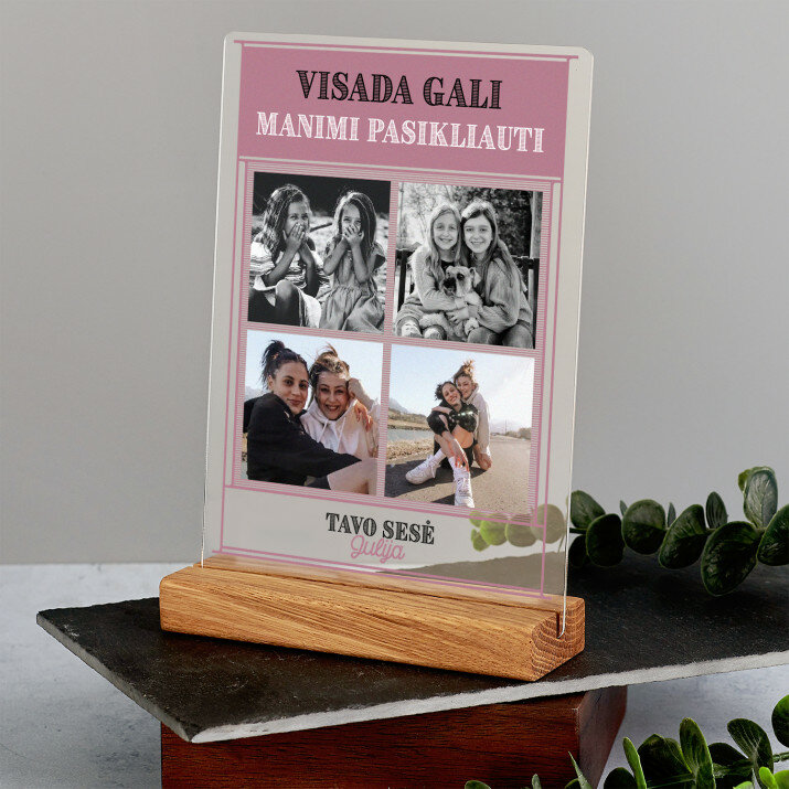 Unikalus suvenyras, kuris pradžiugins apdovanotąjį! Spauda ant 2 mm storio skaidraus akrilinio stiklo (pleksiglas) - tai dovana, kuri tarnaus ilgus metus. Ši medžiaga pasižymi aukšta paviršiaus kokybe ir patvarumu, yra atspari pažeidimams ir išorinėms oro sąlygoms. Elegantiško medinio stovo dėka, spaudinį galima iš karto padėti ant lentynos. Garantuojame, kad tai bus puiki staigmena Jūsų artimiesiems!