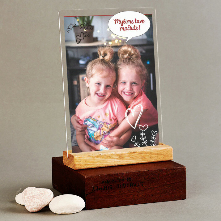 Unikalus suvenyras, kuris pradžiugins apdovanotąjį! Spauda ant 2 mm storio skaidraus akrilinio stiklo (pleksiglas) - tai dovana, kuri tarnaus ilgus metus. Ši medžiaga pasižymi aukšta paviršiaus kokybe ir patvarumu, yra atspari pažeidimams ir išorinėms oro sąlygoms. Elegantiško medinio stovo dėka, spaudinį galima iš karto padėti ant lentynos. Garantuojame, kad tai bus puiki staigmena Jūsų artimiesiems!Stiklo matmenys: 21 x 14,5 cm