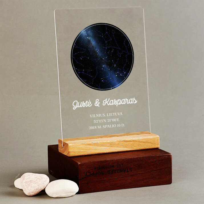 Unikalus suvenyras, kuris pradžiugins apdovanotąjį! Spauda ant 2 mm storio skaidraus akrilinio stiklo (pleksiglas) - tai dovana, kuri tarnaus ilgus metus. Ši medžiaga pasižymi aukšta paviršiaus kokybe ir patvarumu, yra atspari pažeidimams ir išorinėms oro sąlygoms. Elegantiško medinio stovo dėka, spaudinį galima iš karto padėti ant lentynos. Garantuojame, kad tai bus puiki staigmena Jūsų artimiesiems!