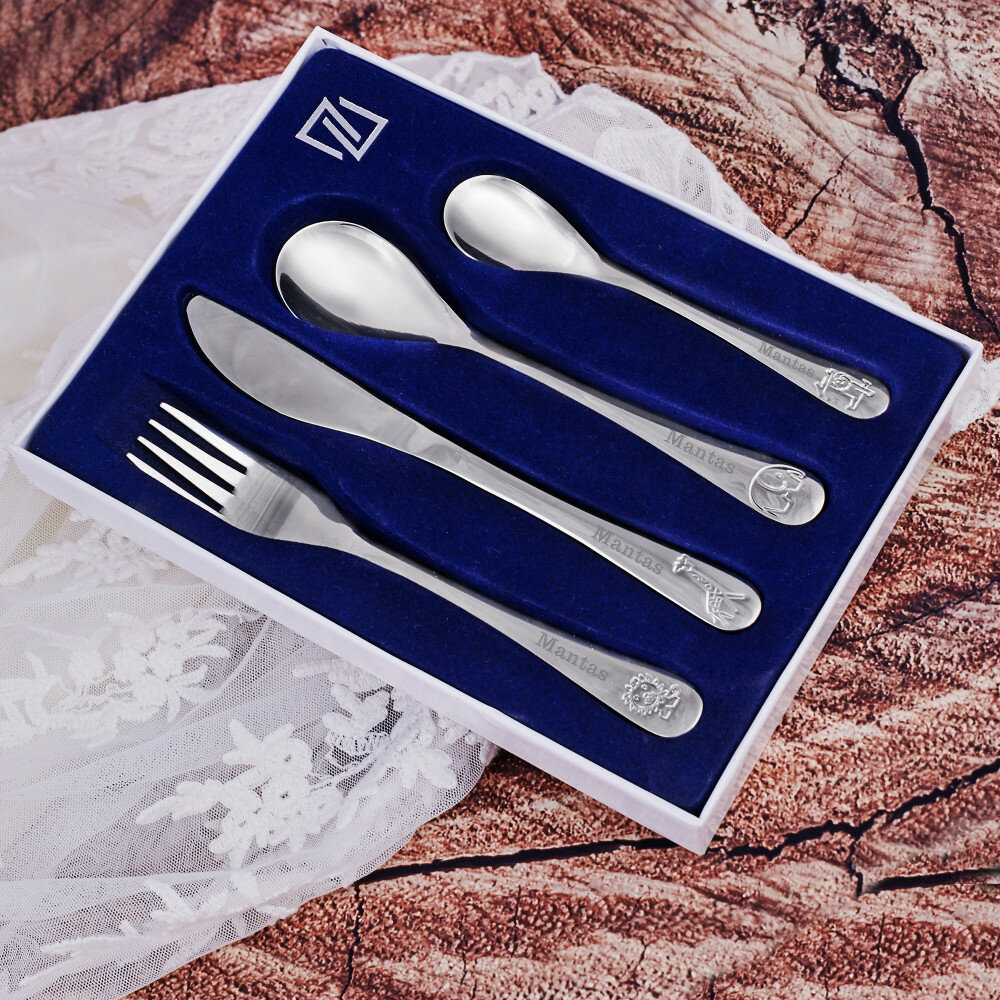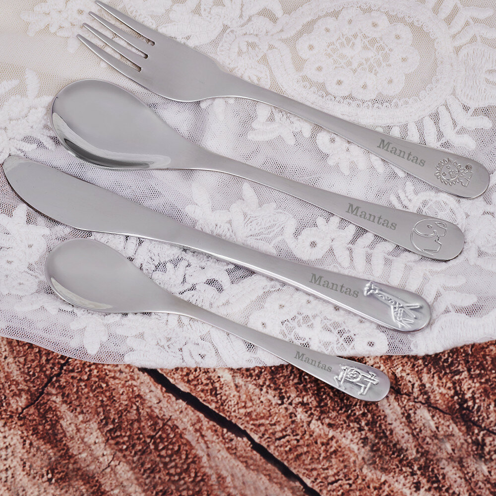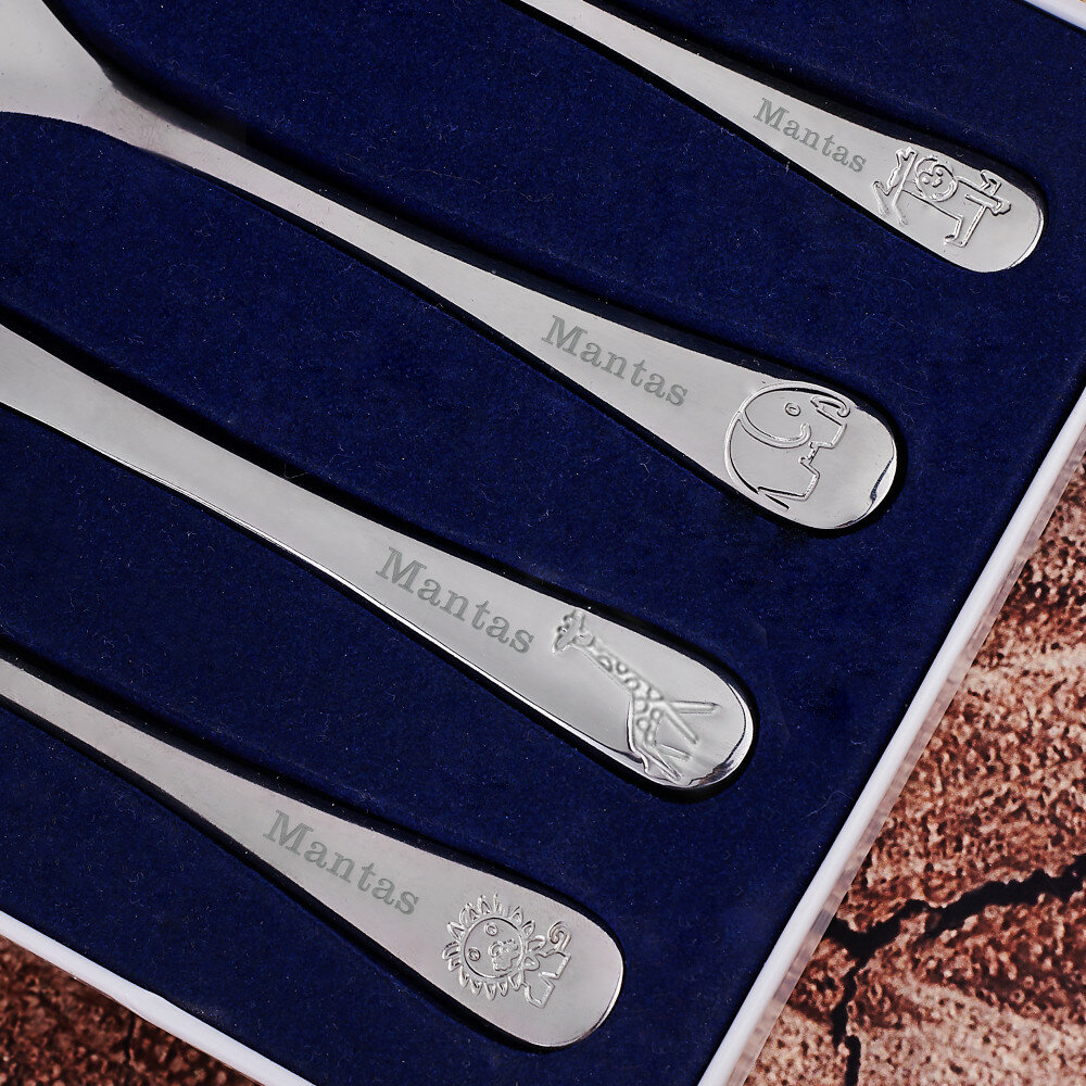 Vaikiškas stalo įrankių rinkinys iš nerūdijančio plieno. Apdaila atlikta aplinkai nekenksminga Silver Colour technologija, todėl gaminys atsparus įbrėžimams ir jo nereikia lakuoti. Plienas padengtas sidabrine galvanine danga (sidabro sudėtyje nėra).Kiekvienas elementas buvo papuoštas gyvūno – dramblio, liūto, žirafos ir beždžionės – atvaizdu.