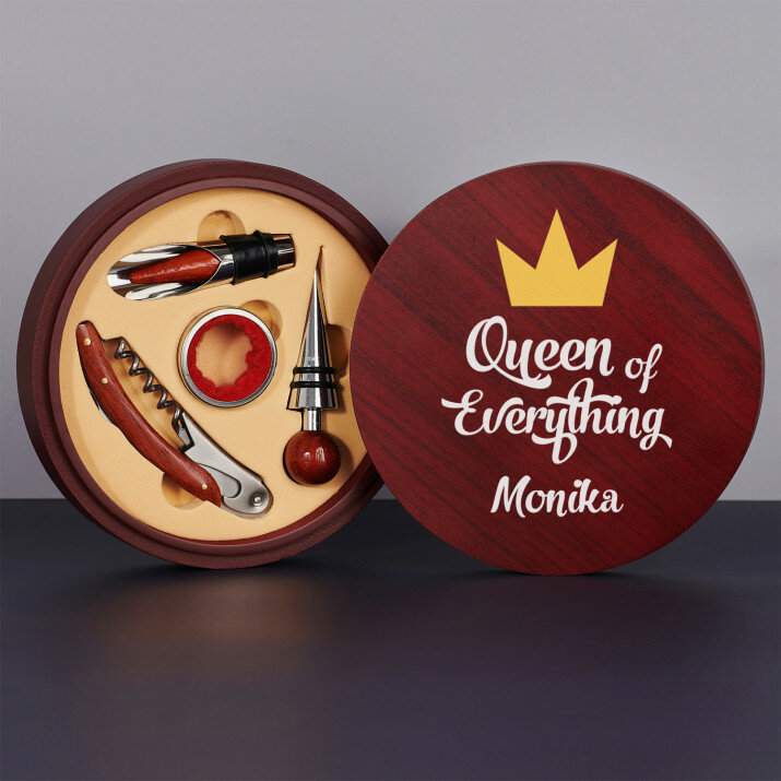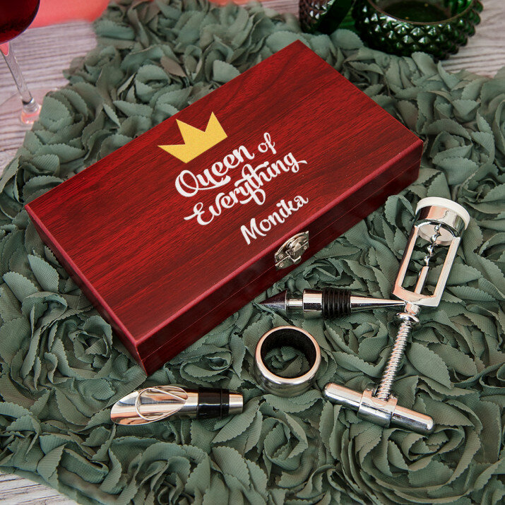 Gražus keturių dalių vyno rinkinys elegantiškoje medinėje dėžutėje su graviravimu ant dangtelio.Rinkinį sudaro kamščiatraukis, 2 kamščiai (įskaitant vieną su piltuvo funkcija) ir žiedas buteliuko kakleliui, apsaugantis nuo lašėjimo.