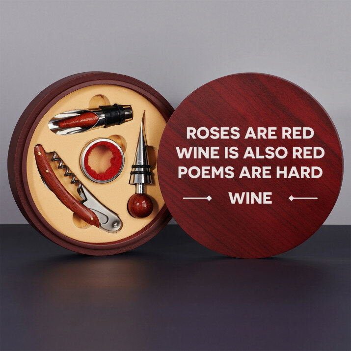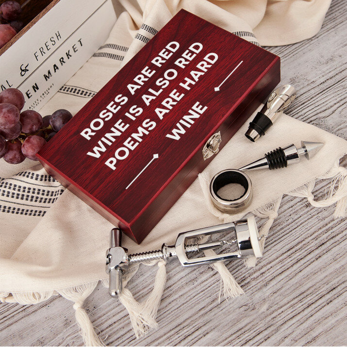 Gražus keturių dalių vyno rinkinys elegantiškoje medinėje dėžutėje su graviravimu ant dangtelio.Rinkinį sudaro kamščiatraukis, 2 kamščiai (įskaitant vieną su piltuvo funkcija) ir žiedas buteliuko kakleliui, apsaugantis nuo lašėjimo.