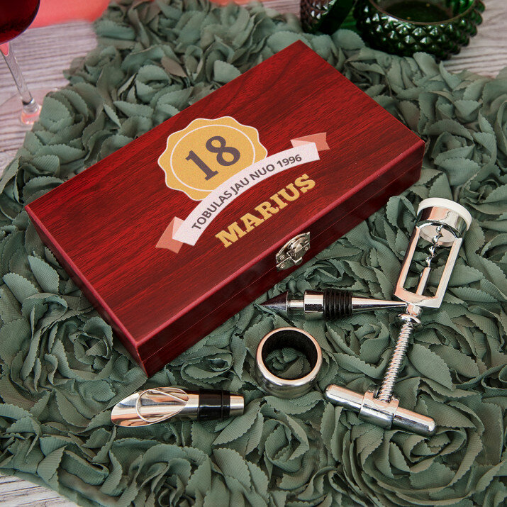 Šį rinkinį pamils kiekvienas vyno mėgėjas! Tokia dovana puikiai tiks jubiliejui, vestuvėms ir daugeliui kitų progų. Vakarai su mėgstamu vynu bus dar malonesni!VYKDYMAS