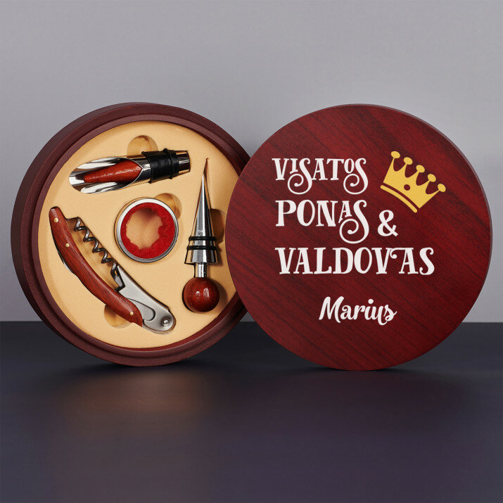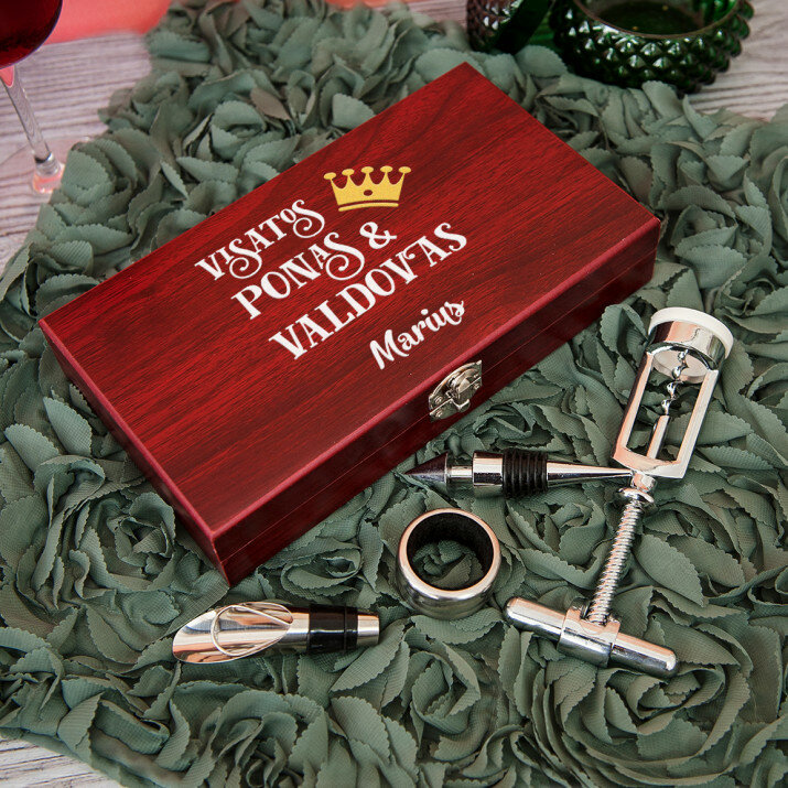 Gražus keturių dalių vyno rinkinys elegantiškoje medinėje dėžutėje su graviravimu ant dangtelio.Rinkinį sudaro kamščiatraukis, 2 kamščiai (įskaitant vieną su piltuvo funkcija) ir žiedas buteliuko kakleliui, apsaugantis nuo lašėjimo.