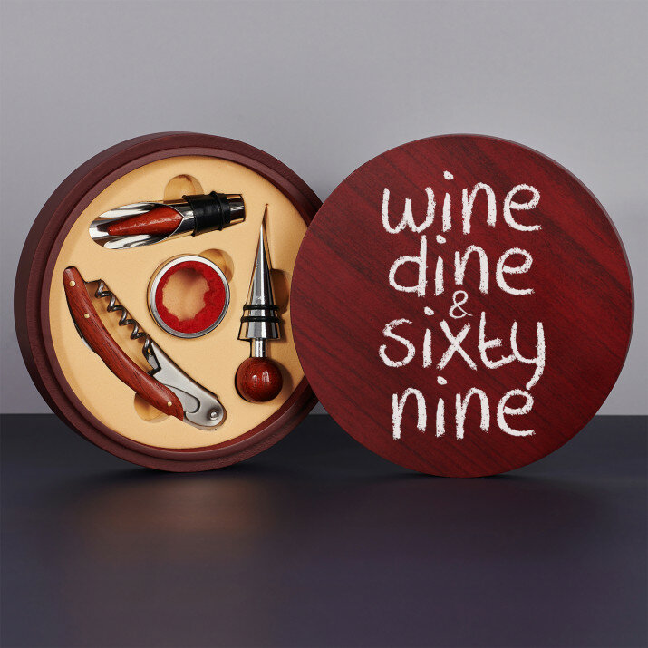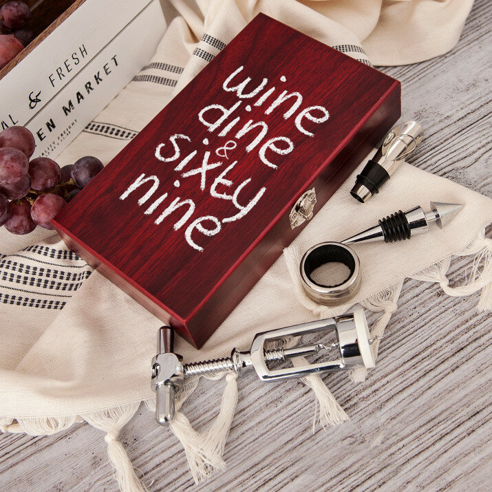 Gražus keturių dalių vyno rinkinys elegantiškoje medinėje dėžutėje su graviravimu ant dangtelio.Rinkinį sudaro kamščiatraukis, 2 kamščiai (įskaitant vieną su piltuvo funkcija) ir žiedas buteliuko kakleliui, apsaugantis nuo lašėjimo.