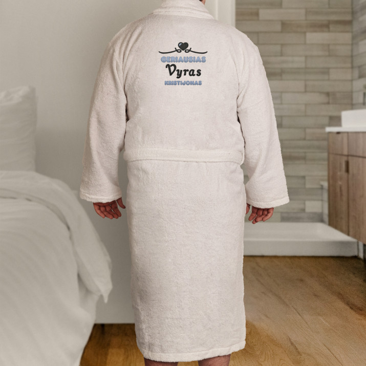 Universalūs baltas chalatas, pagamintas iš 100 % frotte medvilnės. Patogus, gražus, minkštutėlis chalatas suteiks puikų komforto jausmą, kai baigsis visi dienos rūpesčiai ir ateis laikas atsipalaiduoti. Jie taip pat sušildys jūsų mieguistą kūną, kai tik pabusite. Chalatas papuoštas individualizuotu siuvinėjimu, kuris labai gražiai atrodo ir pagerina savijautą, o gaminį paverčia ypatinga dovana!Chalatas yra elegantiško kirpimo, su maža apykakle ir kišenėmis, kad galėtumėte sužibėti savo namų madų šou. Chalato dydis universalus, svoris 350 g/m2. Unisex.