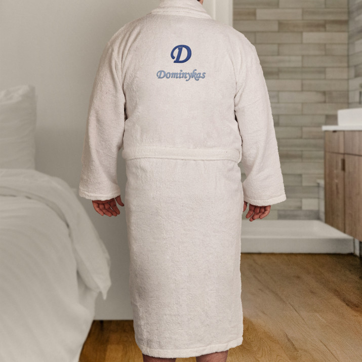 Universalūs baltas chalatas, pagamintas iš 100 % frotte medvilnės. Patogus, gražus, minkštutėlis chalatas suteiks puikų komforto jausmą, kai baigsis visi dienos rūpesčiai ir ateis laikas atsipalaiduoti. Jie taip pat sušildys jūsų mieguistą kūną, kai tik pabusite. Chalatas papuoštas individualizuotu siuvinėjimu, kuris labai gražiai atrodo ir pagerina savijautą, o gaminį paverčia ypatinga dovana!Chalatas yra elegantiško kirpimo, su maža apykakle ir kišenėmis, kad galėtumėte sužibėti savo namų madų šou. Chalato dydis universalus, svoris 350 g/m2. Unisex.