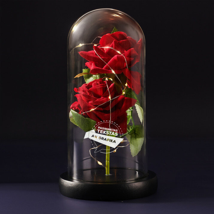 Be to, rožės viduje įtaisytos LED lemputės sukuria romantišką atmosferą. Stiklinio kupolo paviršiuje galite pridėti išgraviruotus inicialus, vardą ar trumpą žinutę, kad ši dovana būtų dar ypatingesnė. Amžinoji rožė pristatoma dovanų dėžutėje.
