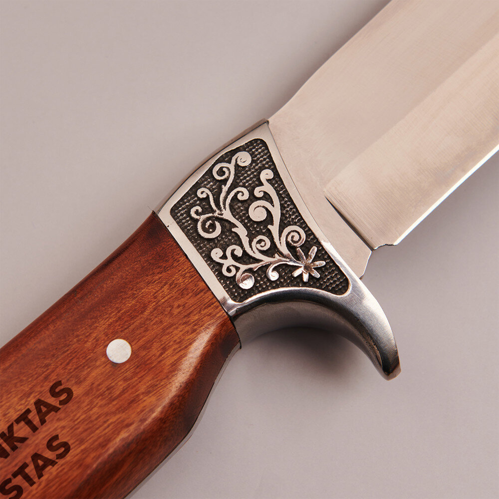 Vienašmenis medžioklinis peilis, pažymėtas TASMAN prekės ženklu, kuris pagrįstas dizaino paprastumu, aukštos kokybės medžiagomis ir kruopščiu apdirbimu. Dėl to peilis niekada Jūsų nenuvils ir tiks bet kokiomis sąlygomis.. Peilis turi rudą medinę rankeną ir elegantišką, asmeninį dėklą, pagamintą iš natūralios odos. Personalizuota rankena ir dėklas.Specifikacijos: