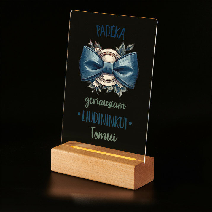 Unikalus suvenyras, kuris nudžiugins gavėją! Spaudinys ant bespalvio 2 mm storio akrilinio stiklo (plexiglass) – tai dovana, kuri tarnaus ilgus metus. Medžiaga išsiskiria puikia paviršiaus kokybe ir standumu, yra atspari pažeidimams ir nepalankioms oro sąlygoms.LED stovas pagamintas iš buko medienos. 3000K spalvų temperatūra suteikia šiltą, atmosferinę šviesą, kurios dėka suasmenintas suvenyras atrodys kaip gražiausia brangenybė. Garantuojame, kad tai bus puiki staigmena Jūsų artimiesiems!